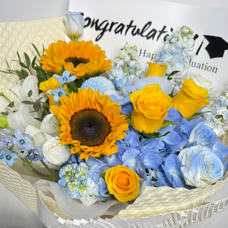 Fresh Flowers: Roses 5 stalks, Matthiola 4 stalks, Eustoma 3 stalks, Lily per stalk, Oxypetalum 5 stalks, Hydrangea per stalk, Sunflowers 2 stalks, Ping Pong per stalk, Phalaenopsis a flower and Eucalyptus per stalk.